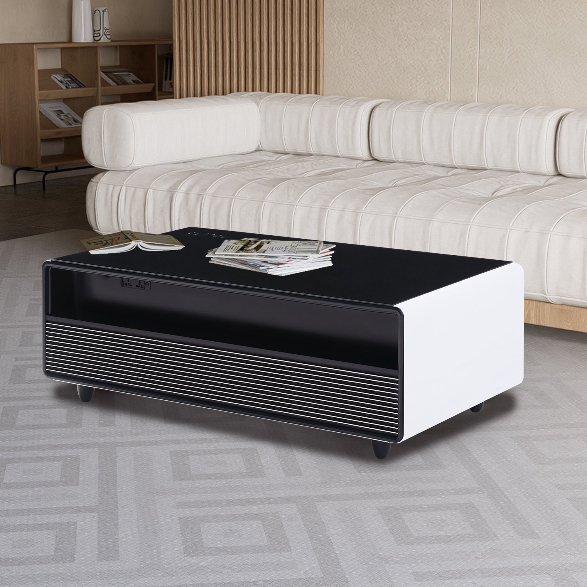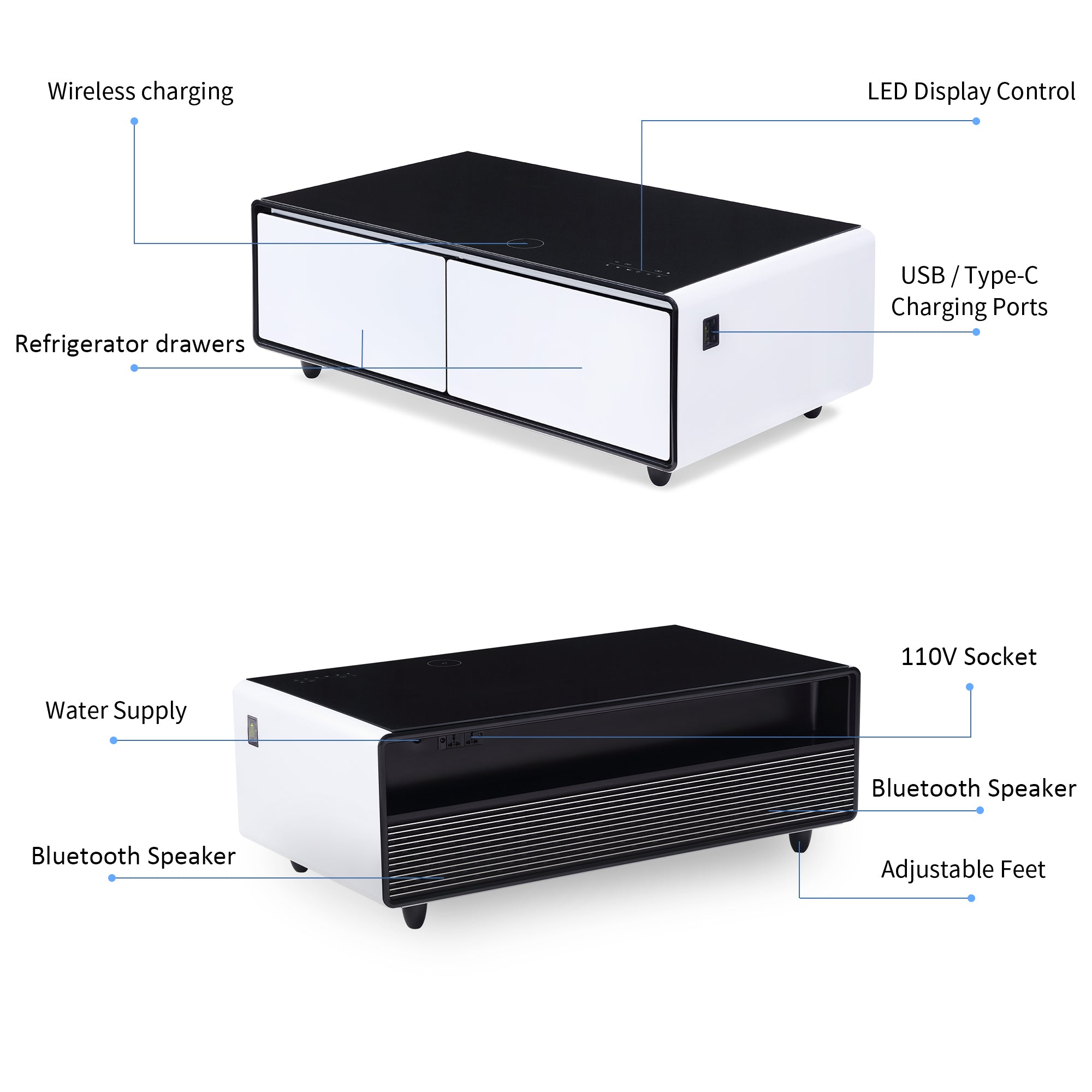 Item Code W1172141167 Product Type General Item Product Name Modern Smart Coffee Table with Built-in Fridge, Bluetooth Speaker, Wireless Charging Module, Touch Control Panel, Power Socket, USB Interface, Outlet Protection, Atmosphere light, White Place of Origin China Main Color White + Black Main Material ABS Product Style Luxury, Modern Use Case Primary Living Space Storage Type Drawers Desk Features Built-in Outlets or USB Desk Shape Rectangular Finish Type Glossy Desk Use Case Coffee & End Tables Assembled Length 50.98 in. Assembled Width 27.76 in. Assembled Height 18.11 in. Weight 121.25 lbs. Package Length 55.68 in. Package Width 32.07 in. Package Height 22.12 in. Package Weight 143.07 lbs.