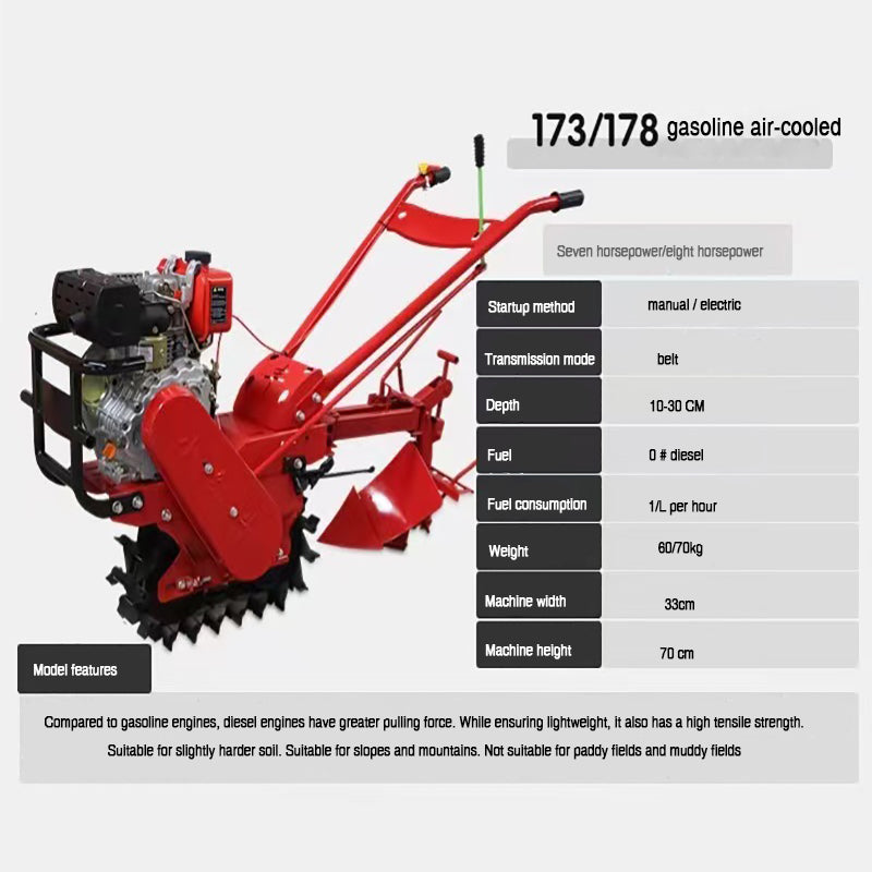 Ultra narrow body,Suitable for walking in the middle of crops without harming them,flexible operation, chain track walking, good grip, anti slip stability, fuel-efficient, lightweight and labor-saving