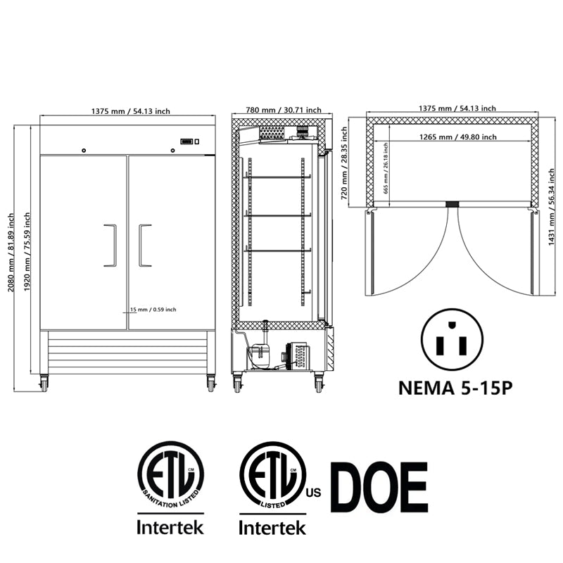 54"W Freezer 2 Section 2 Door Stainless Steel Reach-in 42.2 Cu.ft.